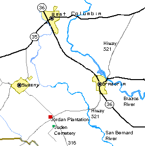 | The Jordan Plantation, with the surrounding communities of Brazoria, Sweeny and West Columbia, also showing the approximate location of the Juden Cemetery | ![]() |