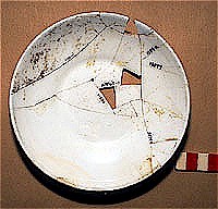 ![]() A ceramic bowl found in this cabin area. These pieces were scattered around the cabin, although the larger pieces were found in one area (they are the white bits in the profile of the wall pictured at the top left picture on this page). |